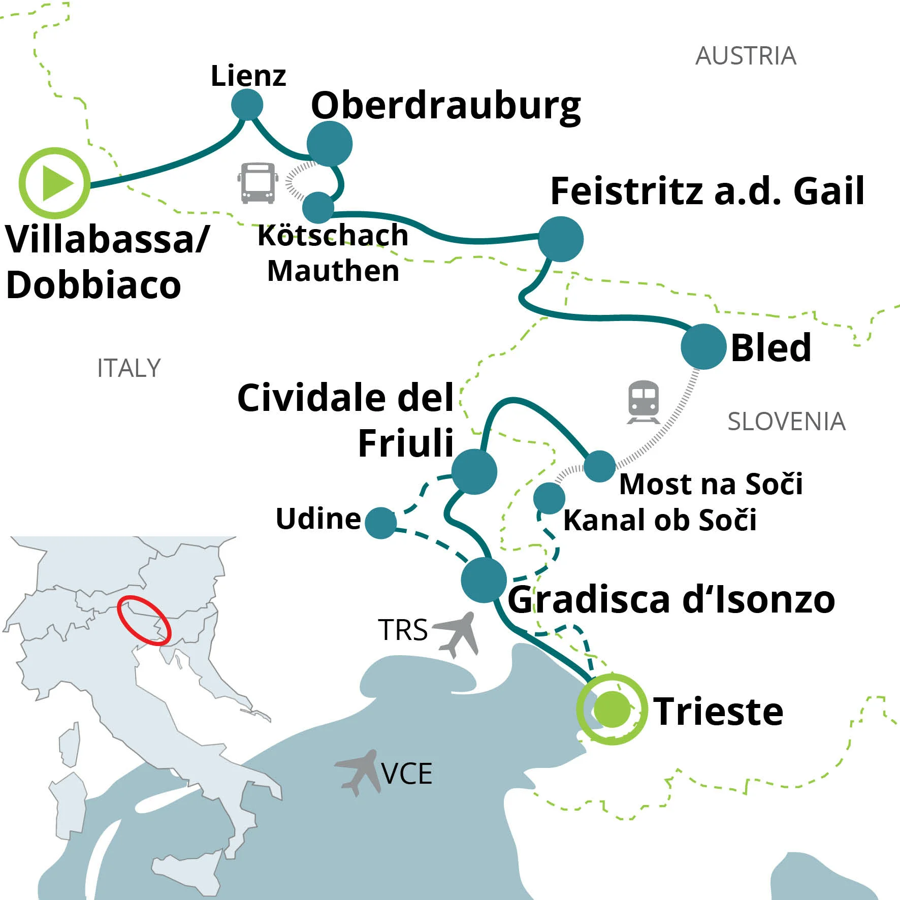 Sur demande, le mercredi et le samedi, transfert Trieste/Alta Pusteria (Dobbiaco ou Villabassa)/ Sillian au prix de 96,00 € par personne + 45,00 € pour votre propre vélo ; réservation et paiement requis au moment de la réservation. Minimum 2 personnes.